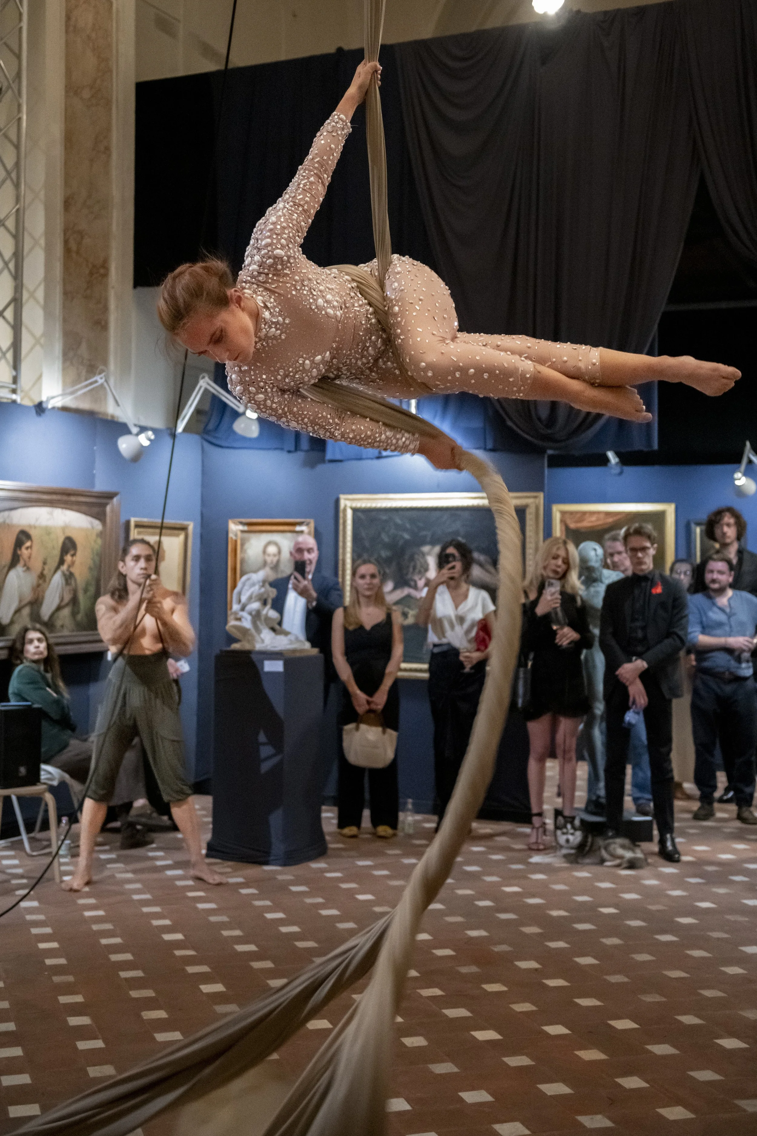 Vernissage performance by aerial acrobats at Compagnia Colonna in Firenze, Italia